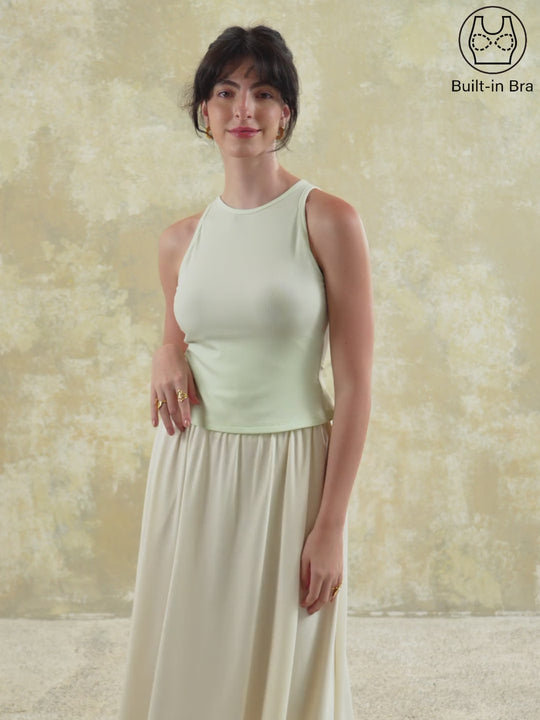 Die minzgrüne Farbe dieses kühlen Brami-Tanks ist super erfrischend – auf der Straße habe ich so viele Blicke bekommen! Kombiniert mit Jeansshorts habe ich es auf einem Musikfestival getragen und in der Menge richtig toll ausgesehen! Der Rückenausschnitt verleiht einem subtilem Sex-Appeal.