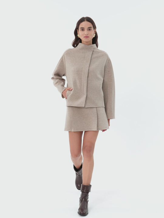 You’ll love this cropped jacket for its effortless sophistication. Designed with a stand collar and hidden button placket for a minimalist finish, it drapes beautifully in a relaxed fit and features pockets for everyday ease.