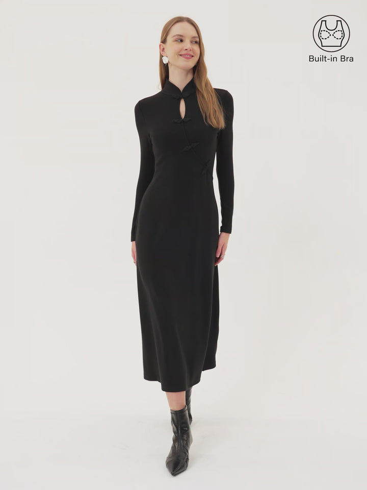 You’ll love this refined dress perfect for both special occasions and everyday sophistication. The mandarin collar and asymmetrical seaming accented with a delicate frog button deliver an elegant yey modern look. It is finished with removable bra pads for comfort and support.