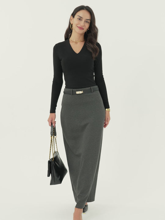 You’ll love this mid-rise pencil skirt that blends a tailored, office-ready look with the comfort of stretch. It is designed with a sleek waistband featuring an invisible zipper, belt loops, and a back slit for easy movement.