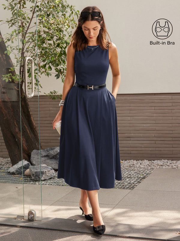 This is your go-to dress for successful client meetings or a fancy dinner. The boat neck beautifully frames your face and shoulders, while the fit-and-flare silhouette enhances your natural curves. Thoughtful details like built-in bra pads and side pockets make it as functional as it is sophisticated.