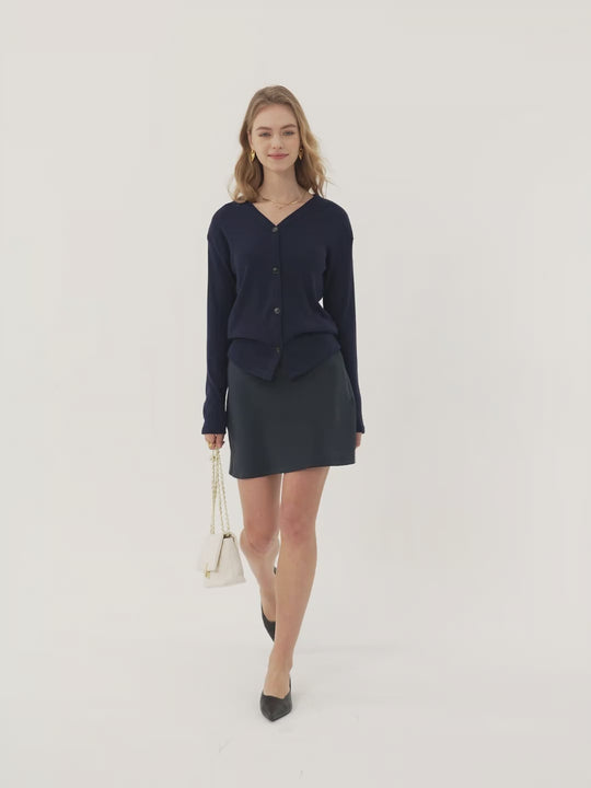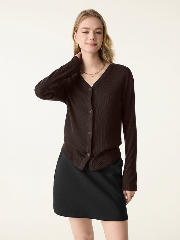 Diese locker geschnittene Strickjacke aus kuscheligem Rippstrick ist perfekt für die Übergangszeit. Mit V-Ausschnitt, Knopfleiste und überschnittenen Schultern für einen lässigen Fall ist sie ein vielseitiges Kleidungsstück, das mühelos wärmt.
