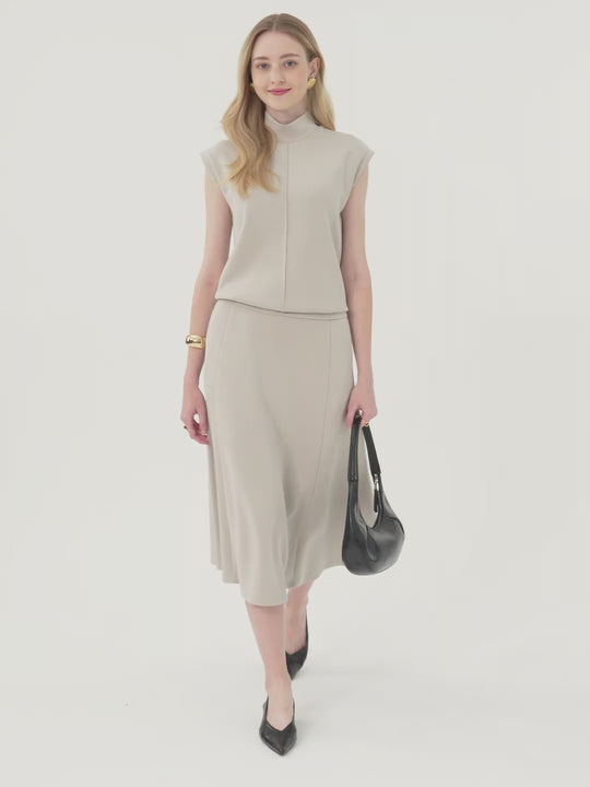You will love this mid-rise midi skirt with its elegant tuck detail and easy pull-on waistband. The mid-calf length and pockets make it a practical yet polished piece for everyday styling.
