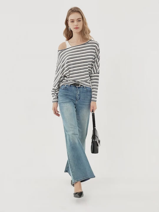 Ein lässiger, knitterfreier Streifenstrickpullover mit dem mühelosen Pariser Chic, der ganz ohne Anstrengung schick wirkt. Der vielseitige U-Boot-Ausschnitt lässt sich auf verschiedene Arten tragen, die Fledermausärmel verleihen ihm einen legeren Fall, und der taillierte Saum und die Bündchen sorgen für eine klare und durchdachte Silhouette.