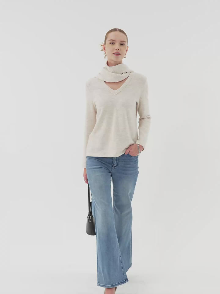Dieses locker sitzende V-Ausschnitt-Top mit seiner weichen Form und dem hohen Hüftschnitt wird Sie begeistern. Die langen Ärmel sorgen für einen lässigen und gemütlichen Look, und mit dem optionalen passenden Schal können Sie jederzeit für einen Hauch von Flair sorgen.