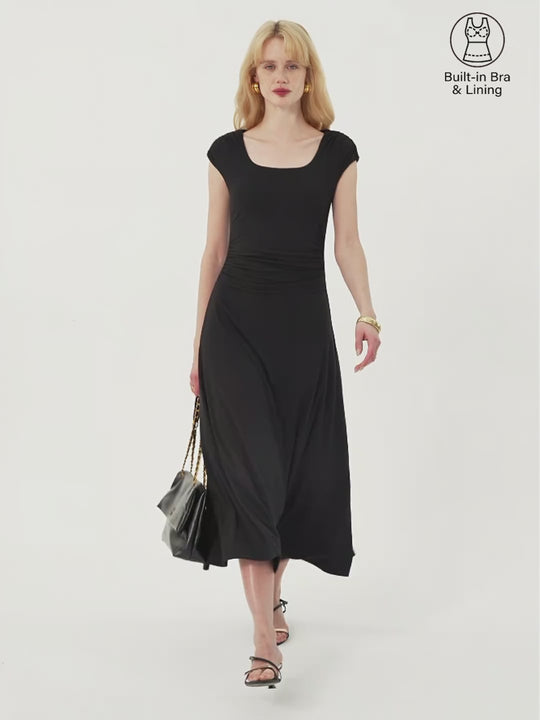 Ein elegantes Kleid mit klarem, eckigem Ausschnitt und sanft gerafften Flügelärmeln. Die Raffung in der Taille formt eine zarte Silhouette, der A-Linien-Saum fällt fließend bis zur Wade, das Kleid ist gefüttert für ein glattes Finish und verfügt über herausnehmbare BH-Einlagen für Komfort und Halt.