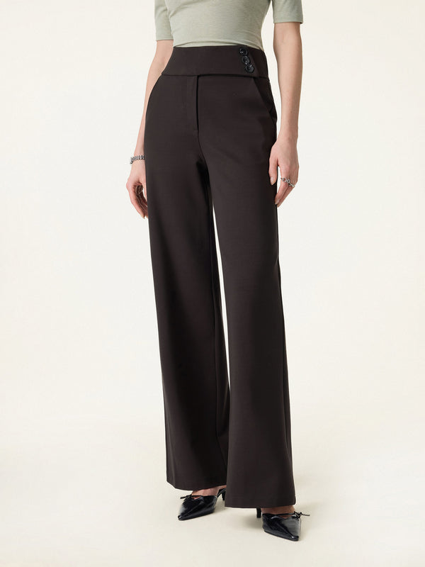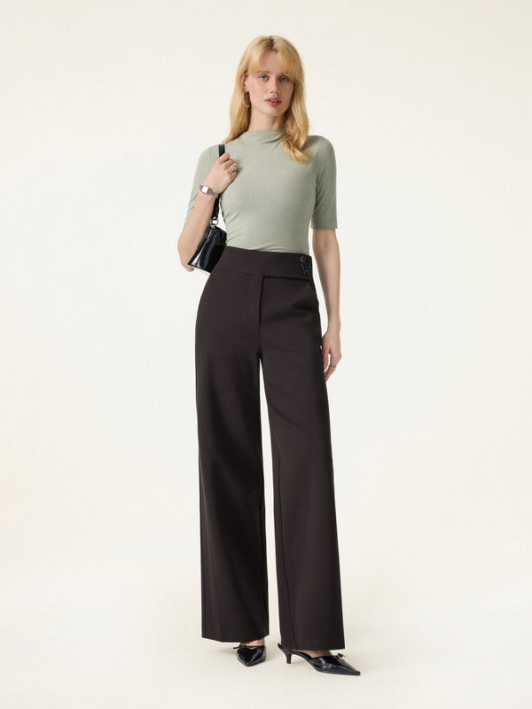 Eine hochgeschnittene, weite Hose, die elegant wirkt, sich aber wie eine Schlupfhose trägt. Der breite Gummibund mit Knopfverschluss sorgt für eine schlankere, höher sitzende Silhouette. Schräge Taschen machen sie praktisch, und die angedeutete Paspelierung hinten verleiht ihr einen gepflegten, eleganten Touch.
