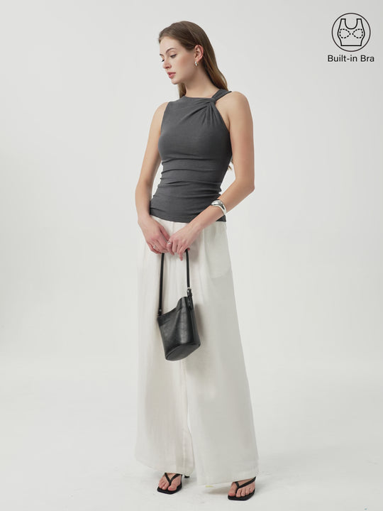 Ein Alltags-Top, das sich edel anfühlt, mit einem asymmetrischen Ausschnitt und einem einzigartigen Knotendetail, das genau das richtige Maß an Interesse weckt. Die schmale Passform in der hohen Hüfte hält es schlicht und lässt sich leicht stylen, und es enthält herausnehmbare BH-Pads für Komfort und Halt.